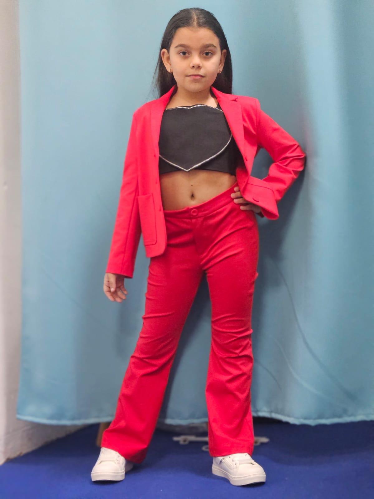 Giacca rossa, top nero a cuore e pantalone rosso a zampa
